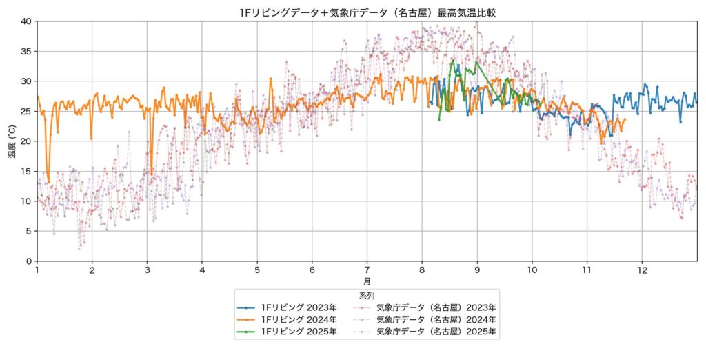 それでは、気象庁(名古屋)の最高気温と、自宅1Fリビングの最高室温を比較したグラフを見ていきます。
