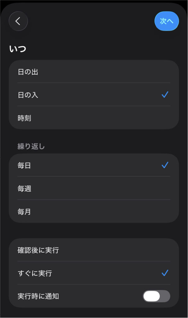 - 朝と夜でそれぞれオートメーションを作成しておくと便利です。
