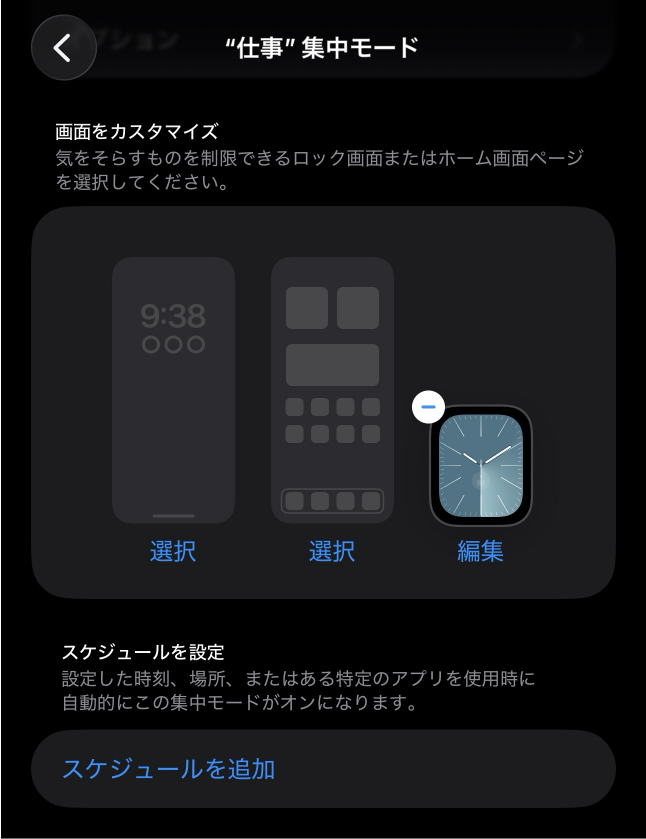 スケジュールを使って、集中モードのみでAppleWatchの文字盤の切り替えの自動化も可能です。