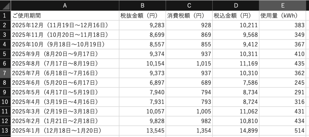 システムからダウンロードしたCSVデータ(ここでは、電力消費量と請求情報データ)対象としています。